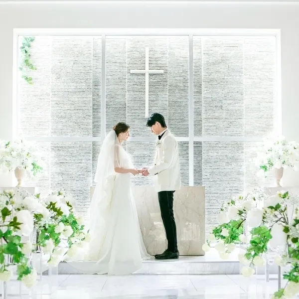 【純白の白を表すノートルダムチャーチ】自然光がおふたりを美しく照らし、感動的なセレモニーでゲストを魅了します。チャーチを見学&入場体験、当日の気持ちをイメージ!新郎新婦様目線でも、プレ体験が可能!